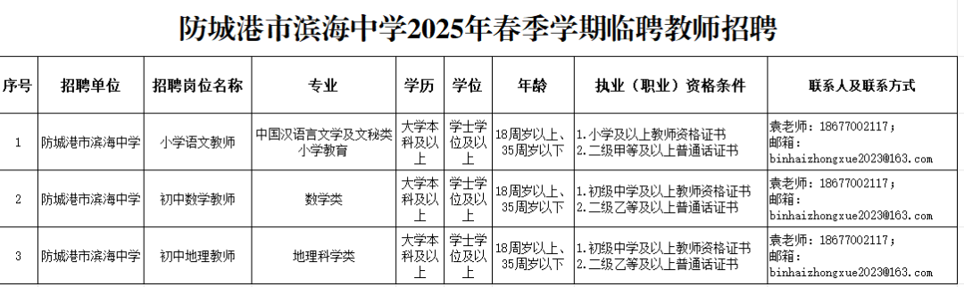 二、報(bào)名方式:1.將個(gè)人簡(jiǎn)歷、學(xué)歷學(xué)位證書(shū)、教師資格證等發(fā)到郵箱:binhaizhongxue2023@163.com(郵件名稱(chēng)備注:姓名+崗位+聯(lián)系方式)2.聯(lián)系電話(huà):袁老師/18677002117