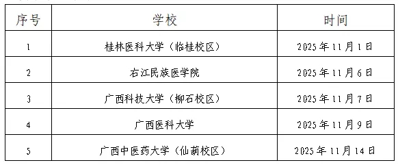 采取現(xiàn)場報(bào)名方式的人員請前往桂林醫(yī)科大學(xué)、右江民族醫(yī)學(xué)院、廣西科技大學(xué)、廣西醫(yī)科大學(xué)、廣西中醫(yī)藥大學(xué)等區(qū)內(nèi)各院校雙選會(huì)現(xiàn)場進(jìn)行應(yīng)聘。廣西區(qū)內(nèi)各院校雙選會(huì)舉辦時(shí)間詳見下表。