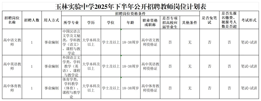 具體招聘信息請瀏覽玉林市人社局網(wǎng)站相關(guān)公告,以《玉林市2025年下半年公開招聘中小學幼兒園教師公告》為準。