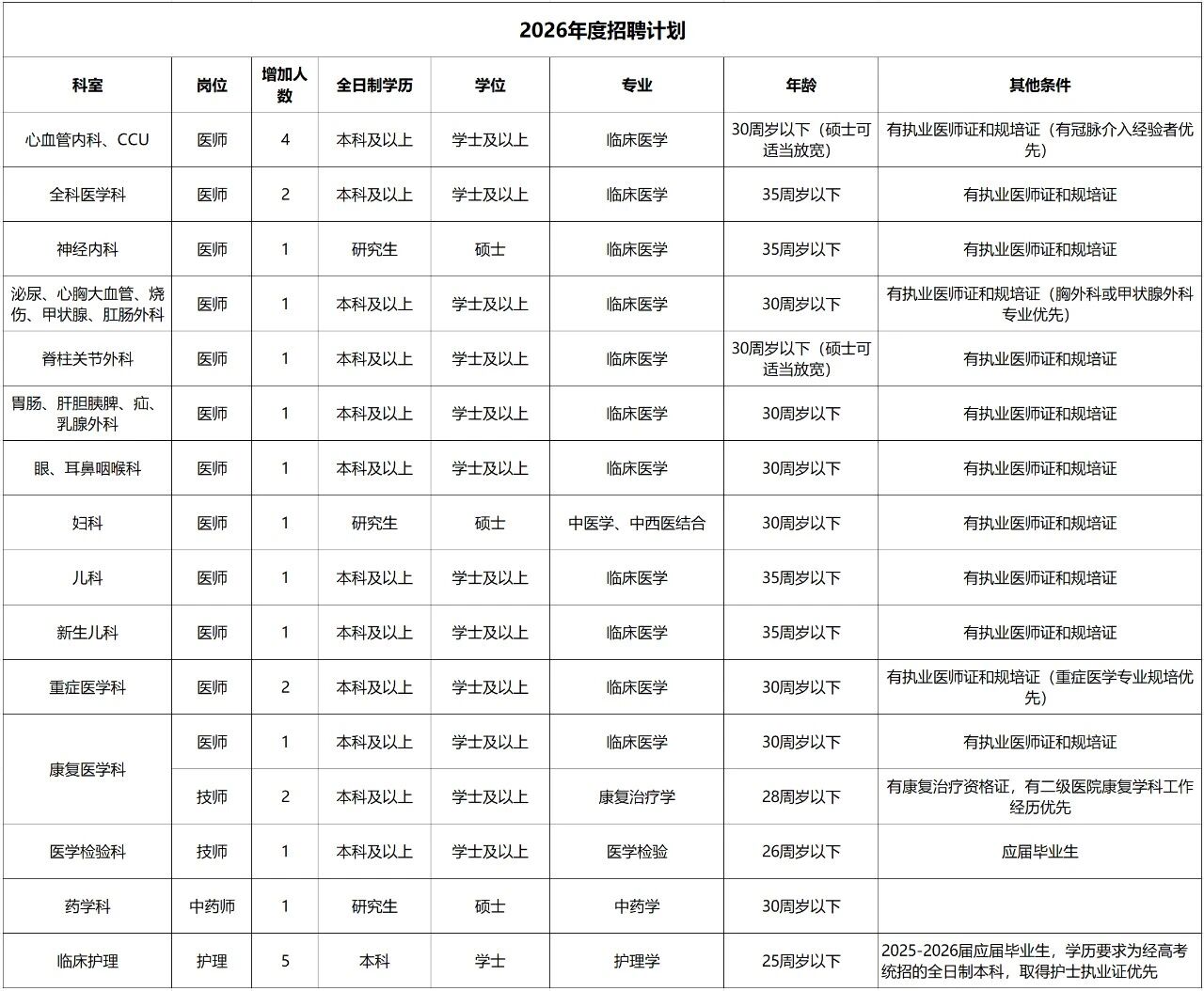 (二)醫(yī)院招聘的所有崗位均要求畢業(yè)時(shí)須同時(shí)取得應(yīng)聘崗位所需的學(xué)歷、學(xué)位證,緊缺崗位可放寬學(xué)位條件。同時(shí)須取得住院醫(yī)師規(guī)范化培訓(xùn)合格證書(shū)、醫(yī)師資格證書(shū)、醫(yī)師執(zhí)業(yè)證書(shū)。