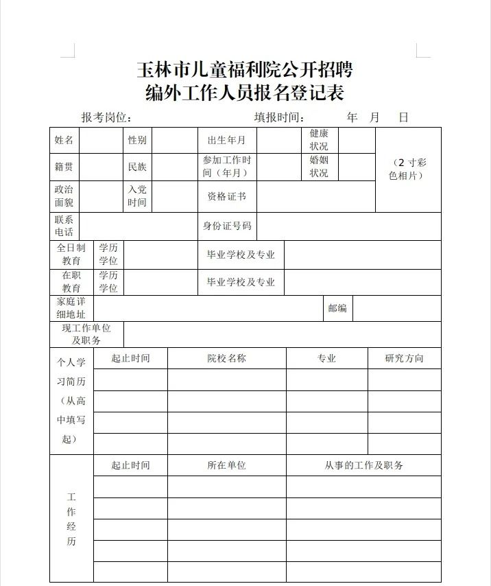 報(bào)名時(shí)提交《玉林市兒童福利院公開招聘編外工作人員報(bào)名登記表》點(diǎn)擊下載,須帶上身份證、學(xué)歷證、資格證等相關(guān)證明材料(原件、復(fù)印件)及近期免冠兩寸標(biāo)準(zhǔn)彩照兩張?!秷?bào)名表》填寫信息必須真實(shí)無誤,凡弄虛作假的,一律取消報(bào)名資格。