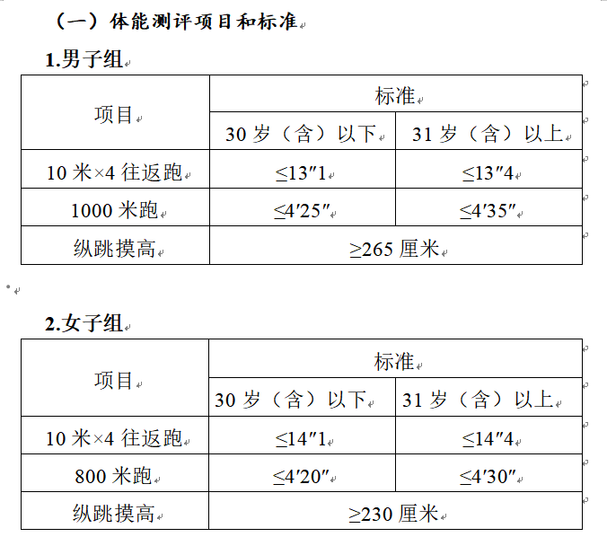 參照《關于印發(fā)<公安機關錄用人民警察體能測評項目和標準>的通知》(公政治〔2024〕60號)執(zhí)行,每個測評項目分別記錄成績。其中縱跳摸高的測評次數(shù)不超過3次,10米×4往返跑測評次數(shù)不超過2次,男子1000米跑、女子800米跑測評次數(shù)均為1次。