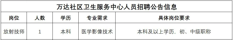 根據(jù)工作需要,銀山街道萬達社區(qū)衛(wèi)生服務中心現(xiàn)向社會招聘相關(guān)崗位人員,所有崗位按社區(qū)人員條件招聘,執(zhí)行社區(qū)待遇,具體崗位需求如下: