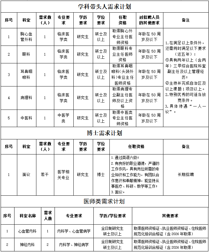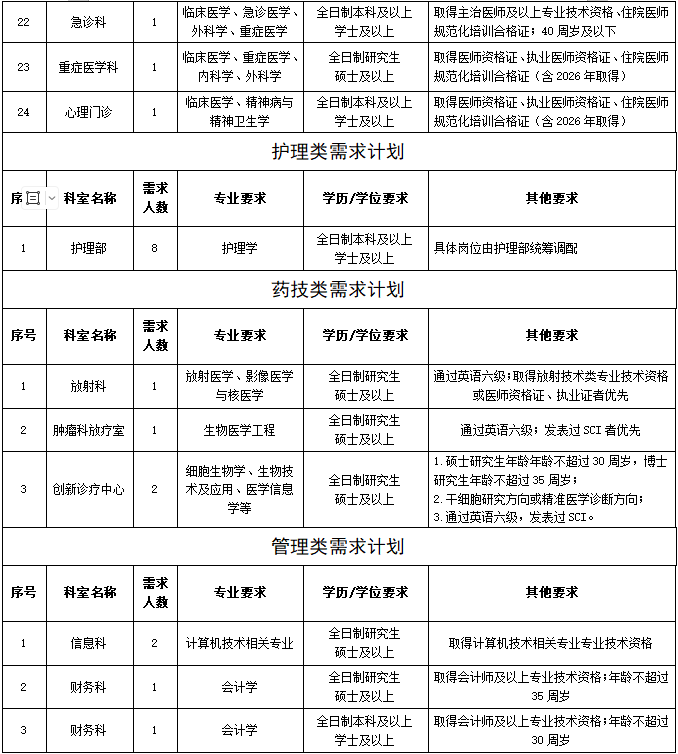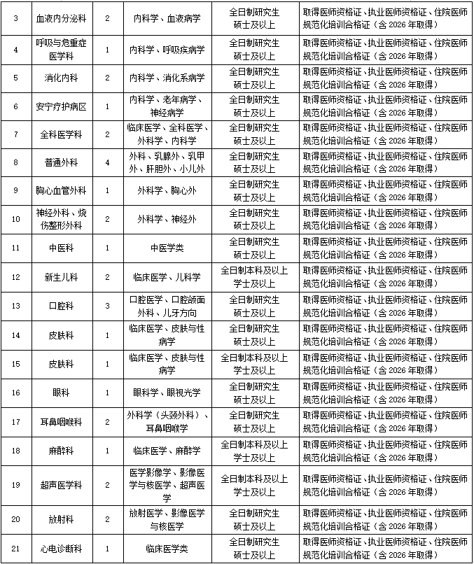 為進一步完善現(xiàn)有人才隊伍,促進醫(yī)院學科發(fā)展,提升醫(yī)院綜合實力,因業(yè)務發(fā)展需要,現(xiàn)面向社會進行公開招聘,具體招聘崗位如下: