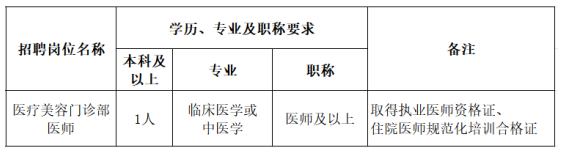 根據(jù)醫(yī)院發(fā)展需要,現(xiàn)面向社會招聘醫(yī)療美容門診部醫(yī)師,有關(guān)招聘事項公告如下: