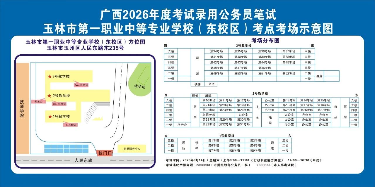 請?zhí)崆傲私獗救怂诳键c具體位置,熟悉考點周邊情況,特別是考點周邊的食宿、交通情況,合理做好食宿安排和出行計劃。需要特別注意的是:玉林市第一職業(yè)中等專業(yè)學(xué)??键c是設(shè)在該校的東校區(qū)(人民東路東235號);玉林市第一中學(xué)考點是設(shè)在該校的運嶺路校區(qū)(二環(huán)北路1228號)!
