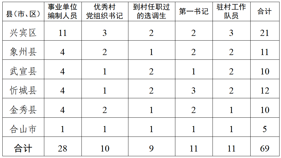 2026年全市計(jì)劃從“五方面人員”中選拔鄉(xiāng)鎮(zhèn)領(lǐng)導(dǎo)班子成員69名,其中:興賓區(qū)21名,象州縣11名,武宣縣10名,忻城縣12名,金秀縣10名,合山市5名。具體選拔計(jì)劃為: