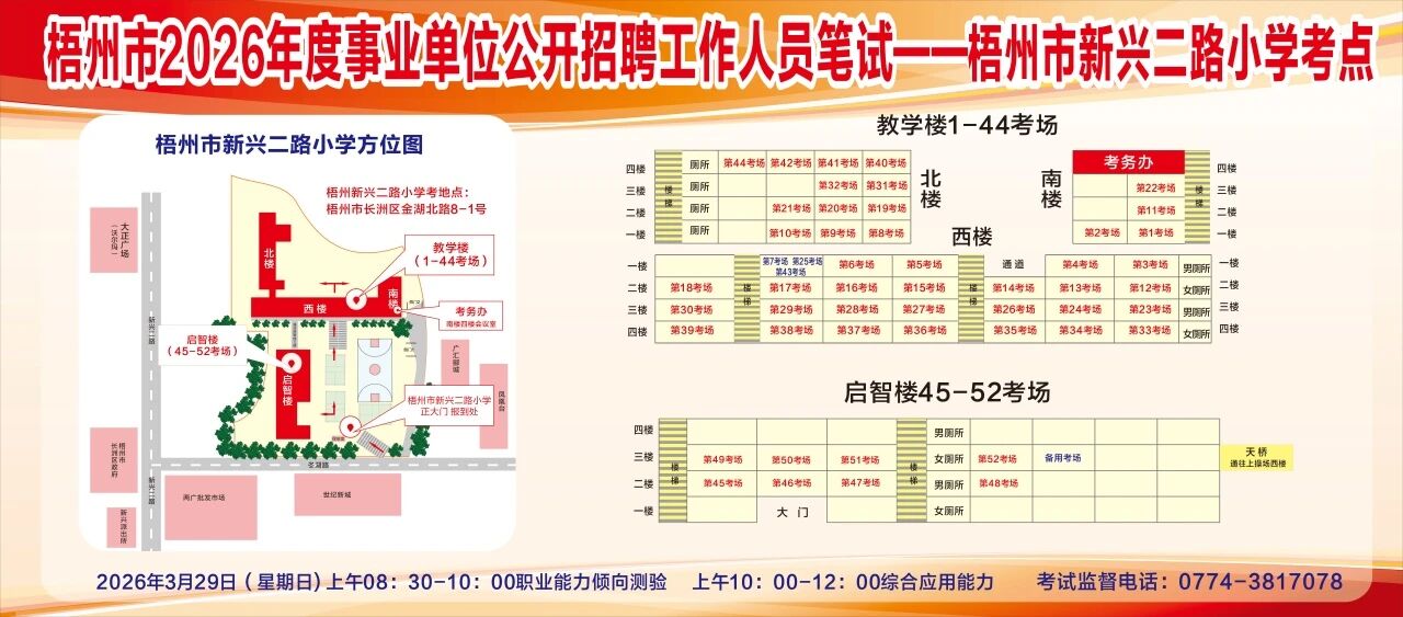 梧州考區(qū)3月28日綜合管理(A類)考試的考點(diǎn)學(xué)校:三中、四中、五中、十五中、十七中、新興小學(xué)、新興二路小學(xué)。3月29日社會(huì)科學(xué)專技(B類)、自然科學(xué)專技(C類)、中小學(xué)教師(D類)和醫(yī)療衛(wèi)生(E類)考試的考點(diǎn)學(xué)校:一中高中部、三中、四中、五中、七中、十五中、十七中、梧州高中、梧州學(xué)院明理教學(xué)樓、新興小學(xué)、新興二路小學(xué)。
